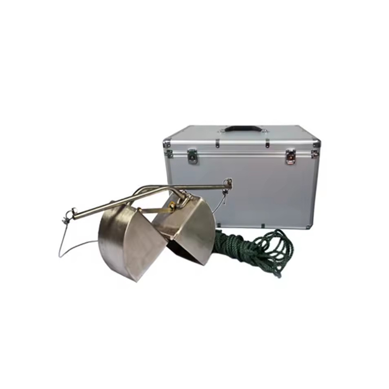 This is a bedload sampler, deployed on a rope or winch, depending on the size of the sampler. During the descent to the bottom the two buckets are held in open position by the means of a hook. When the grab hits the bottom the tension on the hook is released and the hook is disengaged. Upon lifting the buckets dig into the bed of the water body and close.